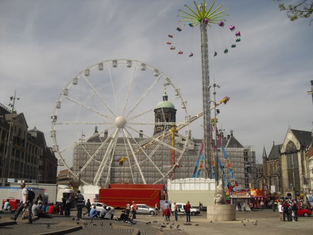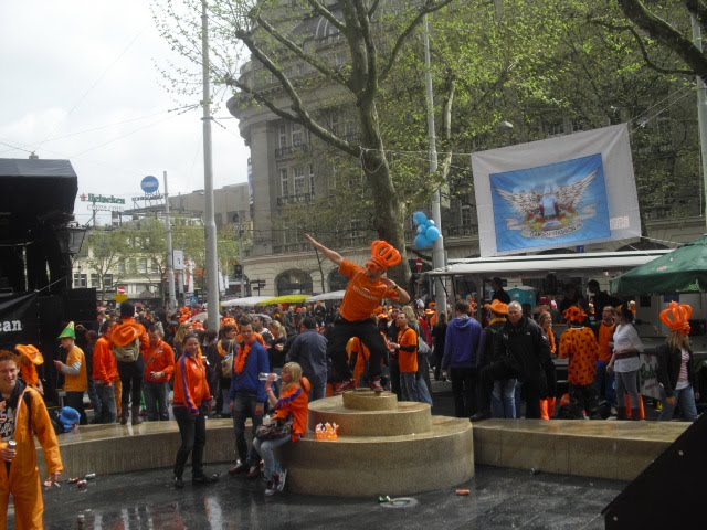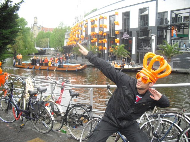 El dia de la Reina en Amsterdam fue la semana pasada, y en dos palabras IM-PRESIONANTE. Fue el 30 de Abril en Amsterdam, y es un dia en el que todos los holandeses salen a la calle vestidos con algo o entero de naranja. Te cuento como lo hicimos. Desde el primer dia que llegue queria ir a Amsterdam y mas aun al dia de la reina, no hubiera ido a ningun viaje solo por ir a ese asi que imaginate las ganas que tenia de ir. Se lo comente a mis amigos y nos propusimos hacer un viaje de locos de solo chicos alli,jeje. Tuvimos muchas charlas de como ibamos, en coche o avion+tren+bus. Al final cogimos un avion desde Pisa (2h en tren desde genova) hasta charleroi, de alli cogimos u ntaxi para 9 hasta Amsterdam directamente. LLegamos el dia 28 , y que hicimos primero?? dejar las maletas en el hostal e ir a ver el barca-inter,luego hicimos lo obligatorio:irnos a un Cafe Shop. Debido a mi odio al tabaco yo me comi con otro amigo una especie de bizcocho que supuestamente tenia marihuana o lo que sea, aunque no nos hizo nada de efecto,jeje. La ciudad es encantadora, incluso de noche tiene mucha vida, y hay un monton de sitios. Es una ciudad en la que no me importaria vivir,jeje. Al dia siguiente, el dia antes de la fiesta grande, hicimos turismo sobre bicis, algo que alli es lo mas cool ;) Te puede atropellar antes una bici que un coche, es impactante todo el monton de gente que va en bici. Me impresiono tb lo bonita que era la ciudad y como aprovechan alli los canales, las casas flotantes estan muy chulas. Cuando vuelva tengo claro que alquilare una de esas pq tiene que estar mu chulo dormir en un barco alli. Esa misma noche del 29 ya habia mucha fiesta en la calle, asi que tuvimos que salir ;) Nos acostamos sobre las 4 aqun al dia siguiente estabamos rebentados tenia que salir bien prontito pq la fiesta comenzaba sobre las 10. Solo te digo que a las 12 del mediodia ya iba muy tocaete,jeje. Estaba chulisimo las djs en la calle, en los balcones de los edificios, en escenarios, etc. Te dejo las fotos y algun enlace para que veas una pequeña parte de ese dia, que sin duda vovlere a vivir todos los años que pueda.