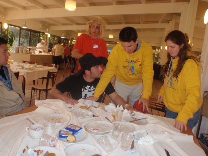 Que se hacia despues? pues aguantabas (la verda no costaba na,jeje) hasta la hora del desayuno que era a las 7:30. ¿Como aguantabas? Pues el primer dia la verdad es que tengo lagunas de verdad pero creo k entre una de las cosas en una casita de los guiris hubo 'after', musica a to volumen y monton de gente con ganas de mas fiesta. Seguro mis primos irian todavia con mas ganas de cubatas encima,jeje yo solo queria desayunar. COn todas las ganas llegue hasta que llegue alli y ¿que habia? Algo que luego se repitio en todos los desayunos: Magdalenas o croasant como se diga con un zumo algo malillo, y un cafe que pase de probar,jeje. Luego ya a dormir la mona hasta que sono el despertador justo para ir a comer.